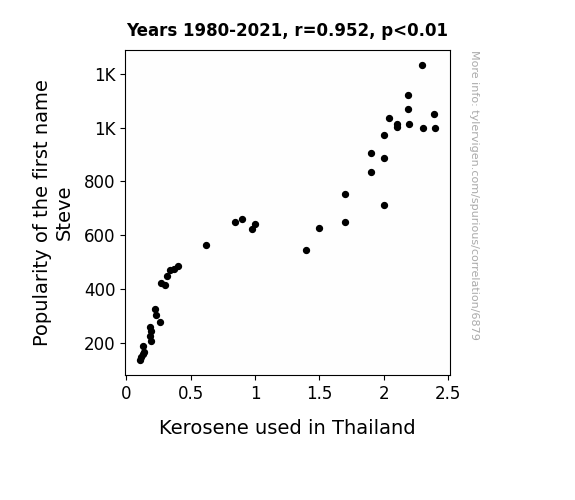 This means 90.6% of the change in the one variable (i.e., Kerosene used in Thailand) is predictable based on the change in the other (i.e., Popularity of the first name Steve) over the 42 years from 1980 through 2021.