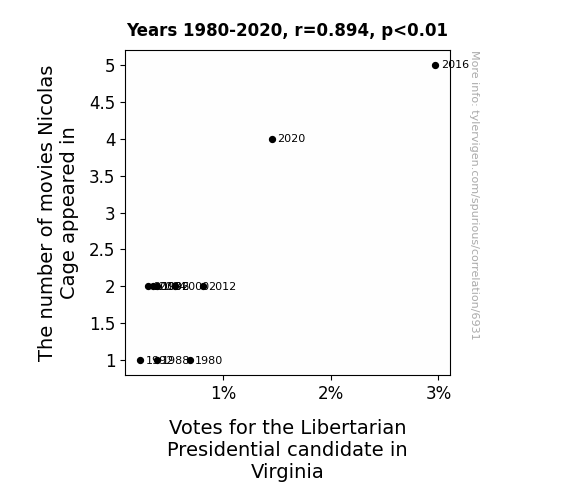 This means 80% of the change in the one variable (i.e., Votes for the Libertarian Presidential candidate in Virginia) is predictable based on the change in the other (i.e., The number of movies Nicolas Cage appeared in) over the 10 years from 1980 through 2020.