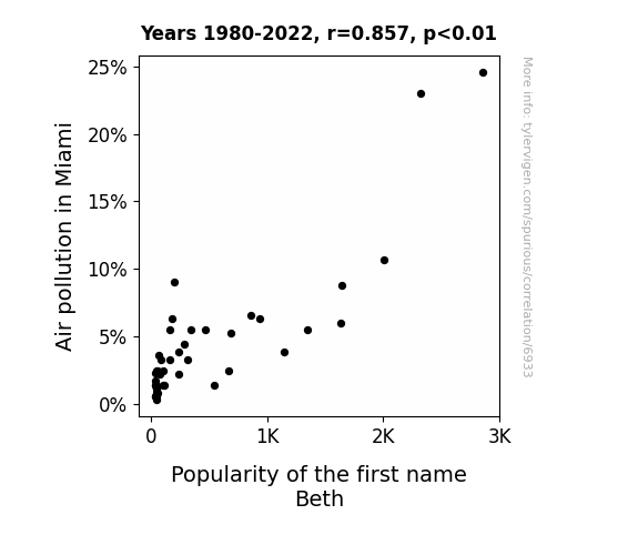 This means 73.4% of the change in the one variable (i.e., Popularity of the first name Beth) is predictable based on the change in the other (i.e., Air pollution in Miami) over the 43 years from 1980 through 2022.