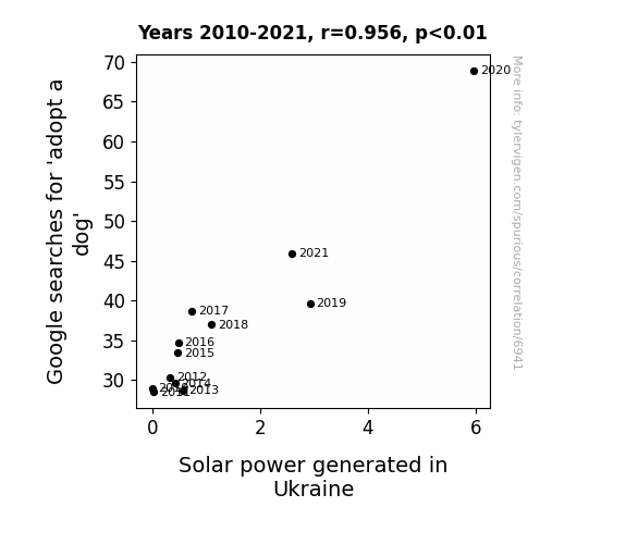 This means 91.4% of the change in the one variable (i.e., Solar power generated in Ukraine) is predictable based on the change in the other (i.e., Google searches for 'adopt a dog') over the 12 years from 2010 through 2021.