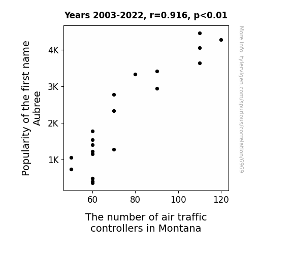 This means 84% of the change in the one variable (i.e., The number of air traffic controllers in Montana) is predictable based on the change in the other (i.e., Popularity of the first name Aubree) over the 20 years from 2003 through 2022.