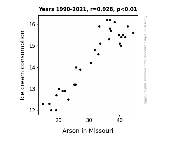 This means 86.1% of the change in the one variable (i.e., Arson in Missouri) is predictable based on the change in the other (i.e., Ice cream consumption) over the 32 years from 1990 through 2021.