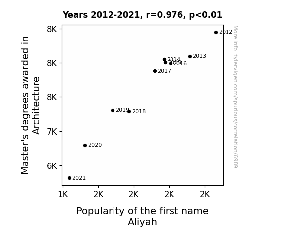 This means 95.2% of the change in the one variable (i.e., Popularity of the first name Aliyah) is predictable based on the change in the other (i.e., Master's degrees awarded in Architecture) over the 10 years from 2012 through 2021.