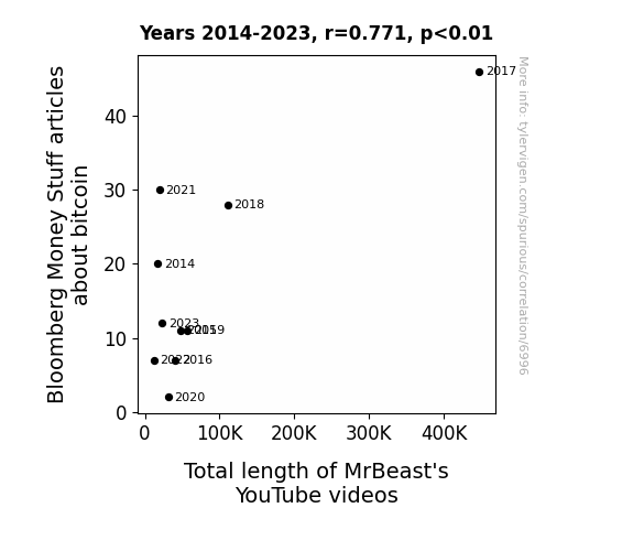 This means 59.5% of the change in the one variable (i.e., Total length of MrBeast's YouTube videos) is predictable based on the change in the other (i.e., Bloomberg Money Stuff articles about bitcoin) over the 10 years from 2014 through 2023.