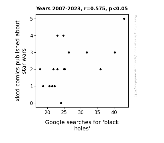 This means 33.1% of the change in the one variable (i.e., Google searches for 'black holes') is predictable based on the change in the other (i.e., xkcd comics published about star wars) over the 17 years from 2007 through 2023.