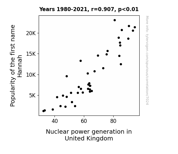 This means 82.3% of the change in the one variable (i.e., Nuclear power generation in United Kingdom) is predictable based on the change in the other (i.e., Popularity of the first name Hannah) over the 42 years from 1980 through 2021.