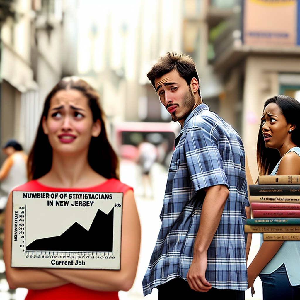 Create a meme inspired by the distracted boyfriend meme that in some way references The number of statisticians in New Jersey. Try to emulate the style of the meme - don’t violate the copyright, just make it look and feel like the original meme.