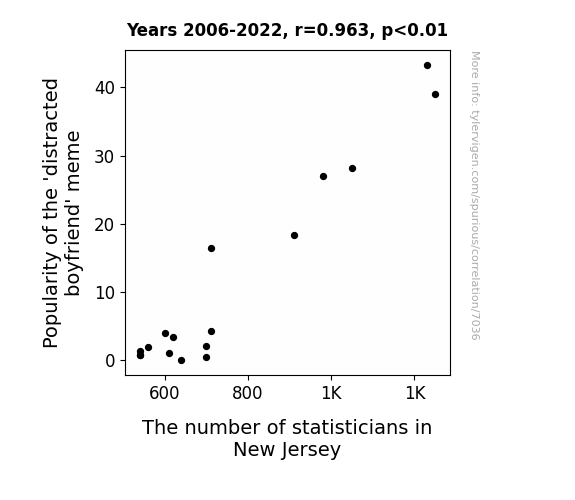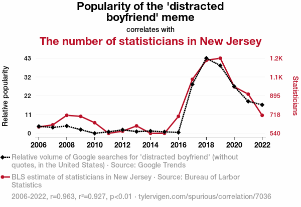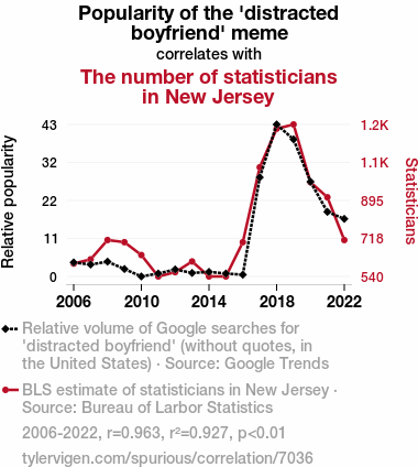 - The spurious research paper: Statistically Distracted: The Perplexing Correlation Between the 'Distracted Boyfriend' Meme Popularity and the Number of Statisticians in New Jersey