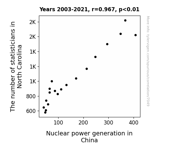 This means 93.5% of the change in the one variable (i.e., Nuclear power generation in China) is predictable based on the change in the other (i.e., The number of statisticians in North Carolina) over the 19 years from 2003 through 2021.