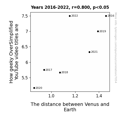 This means 64% of the change in the one variable (i.e., The distance between Venus and Earth) is predictable based on the change in the other (i.e., How geeky OverSimplified YouTube video titles are) over the 7 years from 2016 through 2022.
