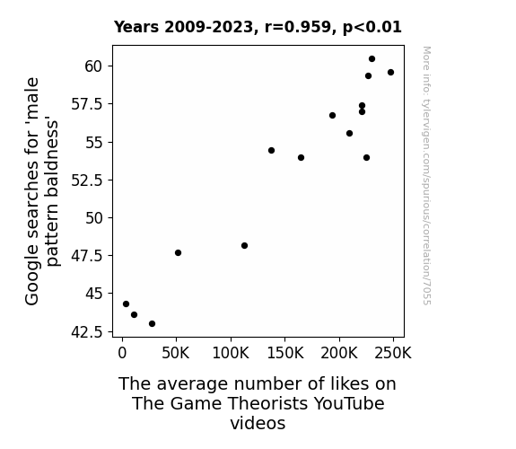 This means 91.9% of the change in the one variable (i.e., The average number of likes on The Game Theorists YouTube videos) is predictable based on the change in the other (i.e., Google searches for 'male pattern baldness') over the 15 years from 2009 through 2023.