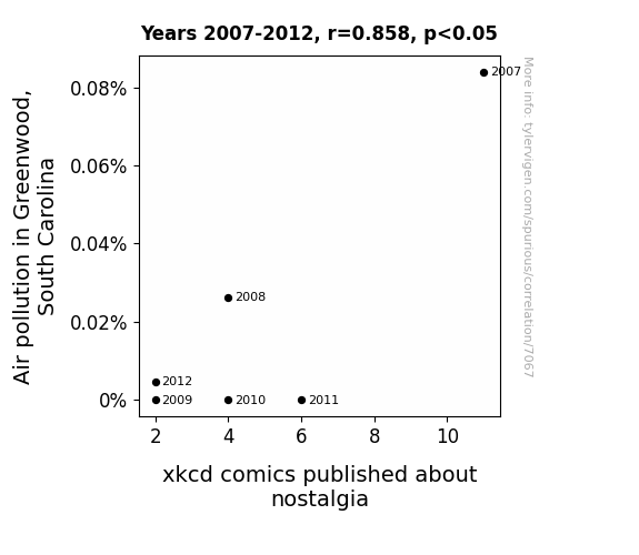 This means 73.6% of the change in the one variable (i.e., xkcd comics published about nostalgia) is predictable based on the change in the other (i.e., Air pollution in Greenwood, South Carolina) over the 6 years from 2007 through 2012.