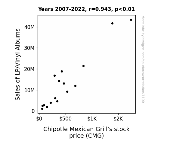 This means 88.9% of the change in the one variable (i.e., Chipotle Mexican Grill's stock price (CMG)) is predictable based on the change in the other (i.e., Sales of LP/Vinyl Albums) over the 16 years from 2007 through 2022.