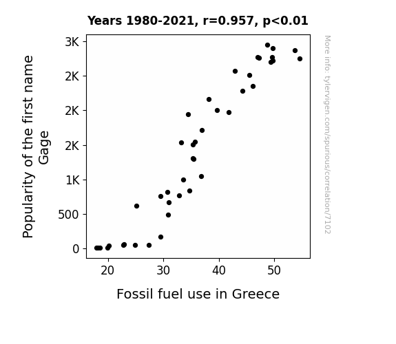This means 91.6% of the change in the one variable (i.e., Fossil fuel use in Greece) is predictable based on the change in the other (i.e., Popularity of the first name Gage) over the 42 years from 1980 through 2021.