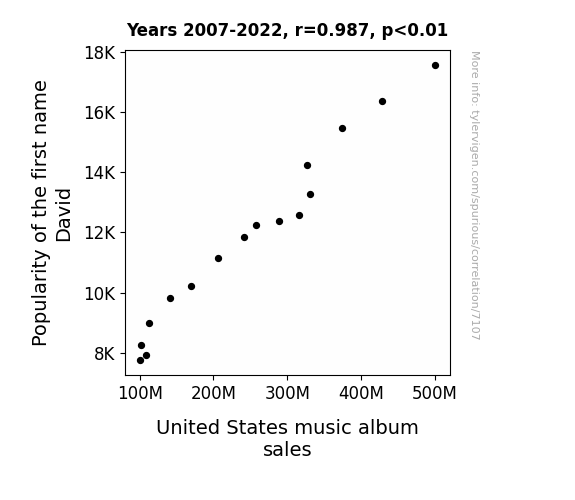 This means 97.5% of the change in the one variable (i.e., United States music album sales) is predictable based on the change in the other (i.e., Popularity of the first name David) over the 16 years from 2007 through 2022.