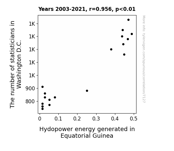 This means 91.4% of the change in the one variable (i.e., Hydopower energy generated in Equatorial Guinea) is predictable based on the change in the other (i.e., The number of statisticians in Washington D.C.) over the 19 years from 2003 through 2021.