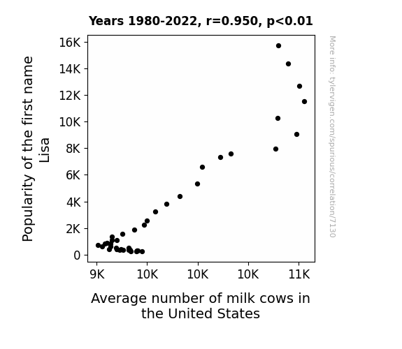 This means 90.2% of the change in the one variable (i.e., Average number of milk cows in the United States) is predictable based on the change in the other (i.e., Popularity of the first name Lisa) over the 43 years from 1980 through 2022.