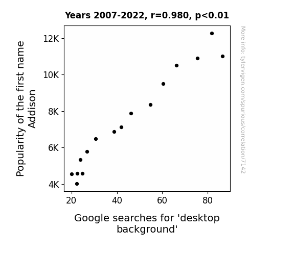 This means 96.1% of the change in the one variable (i.e., Google searches for 'desktop background') is predictable based on the change in the other (i.e., Popularity of the first name Addison) over the 16 years from 2007 through 2022.