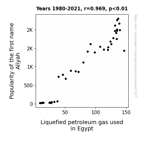 This means 93.8% of the change in the one variable (i.e., Liquefied petroleum gas used in Egypt) is predictable based on the change in the other (i.e., Popularity of the first name Aliyah) over the 42 years from 1980 through 2021.