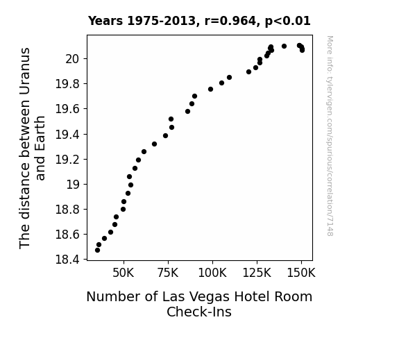 This means 92.9% of the change in the one variable (i.e., Number of Las Vegas Hotel Room Check-Ins) is predictable based on the change in the other (i.e., The distance between Uranus and Earth) over the 39 years from 1975 through 2013.