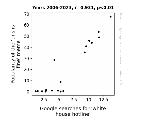 This means 86.6% of the change in the one variable (i.e., Google searches for 'white house hotline') is predictable based on the change in the other (i.e., Popularity of the 'this is fine' meme) over the 18 years from 2006 through 2023.