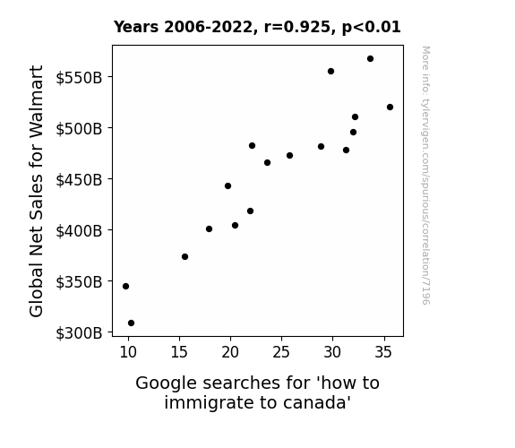This means 85.6% of the change in the one variable (i.e., Google searches for 'how to immigrate to canada') is predictable based on the change in the other (i.e., Global Net Sales for Walmart) over the 17 years from 2006 through 2022.
