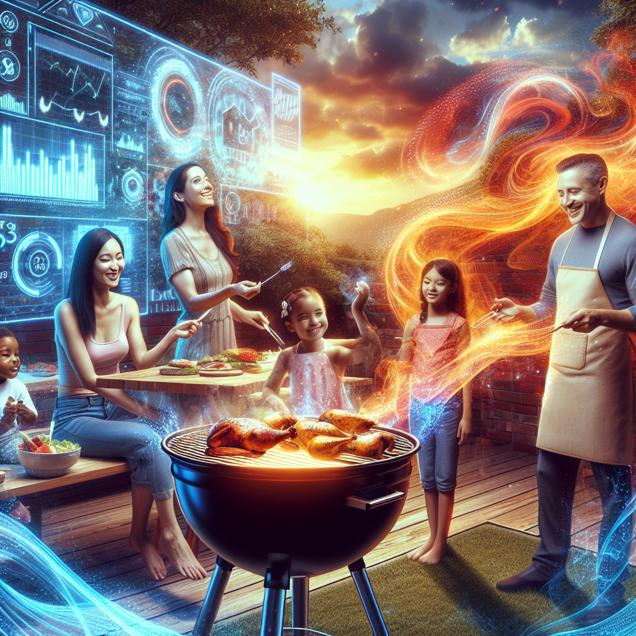 Prompt: Generate an image of a cozy backyard setting with a high-tech twist. Show a family gathered around a sizzling barbecue, with a futuristic grill emitting a sleek, vibrant glow. The scene is filled with the delicious aroma of grilling meats and poultry, depicted through swirling, ethereal wisps of savory scents. The family's smiles are radiant and enhanced with subtle technological highlights reflecting their overall happiness. In the background, a digital ticker symbolizing the stock market displays the soaring price of Accenture, with a modern, dynamic representation of business growth and success. The visual should seamlessly blend the traditional warmth of a family barbecue with elements of cutting-edge technology, creating an evocative and visually striking scene. The depiction should include only scenes, people, and objects, it should not include text or speech bubbles.