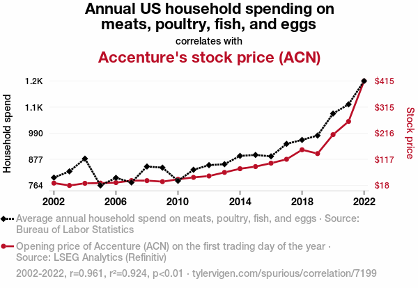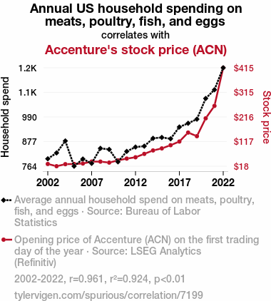 - The spurious research paper: Meat-ing the Market: A Correlational Analysis of US Household Spending on Animal Proteins and Accenture's Stock Price