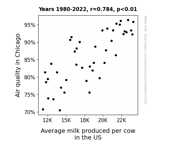 This means 61.5% of the change in the one variable (i.e., Average milk produced per cow in the US) is predictable based on the change in the other (i.e., Air quality in Chicago) over the 43 years from 1980 through 2022.