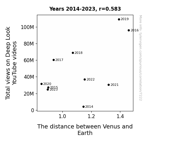 A linear line chart with years as the X-axis and two variables on the Y-axis. The first variable is Total views on Deep Look YouTube videos and the second variable is The distance between Venus and Earth.  The chart goes from 2014 to 2023, and the two variables track closely in value over that time. Small Image