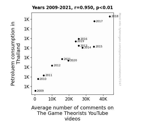 This means 90.3% of the change in the one variable (i.e., Average number of comments on The Game Theorists YouTube videos) is predictable based on the change in the other (i.e., Petroluem consumption in Thailand) over the 13 years from 2009 through 2021.