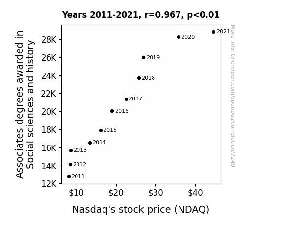 This means 93.4% of the change in the one variable (i.e., Nasdaq's stock price (NDAQ)) is predictable based on the change in the other (i.e., Associates degrees awarded in Social sciences and history) over the 11 years from 2011 through 2021.