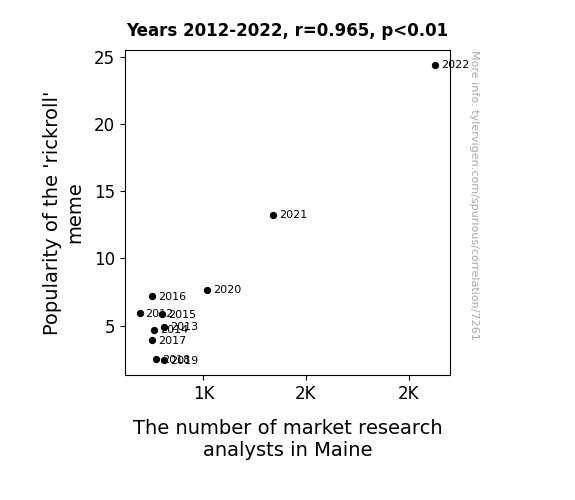 This means 93.1% of the change in the one variable (i.e., The number of market research analysts in Maine) is predictable based on the change in the other (i.e., Popularity of the 'rickroll' meme) over the 11 years from 2012 through 2022.