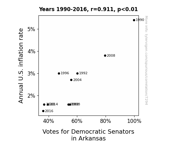 This means 83% of the change in the one variable (i.e., Votes for Democratic Senators in Arkansas) is predictable based on the change in the other (i.e., Annual U.S. inflation rate) over the 10 years from 1990 through 2016.