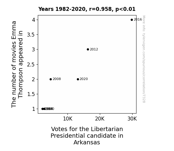 This means 91.8% of the change in the one variable (i.e., Votes for the Libertarian Presidential candidate in Arkansas) is predictable based on the change in the other (i.e., The number of movies Emma Thompson appeared in) over the 7 years from 1982 through 2020.