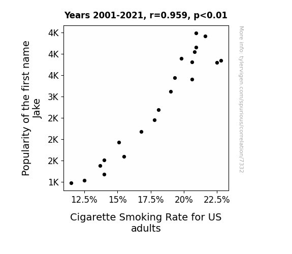This means 92% of the change in the one variable (i.e., Cigarette Smoking Rate for US adults) is predictable based on the change in the other (i.e., Popularity of the first name Jake) over the 21 years from 2001 through 2021.