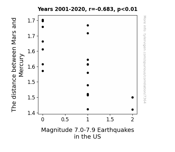 This means 46.7% of the change in the one variable (i.e., Magnitude 7.0-7.9 Earthquakes in the US) is predictable based on the change in the other (i.e., The distance between Mars and Mercury) over the 20 years from 2001 through 2020.