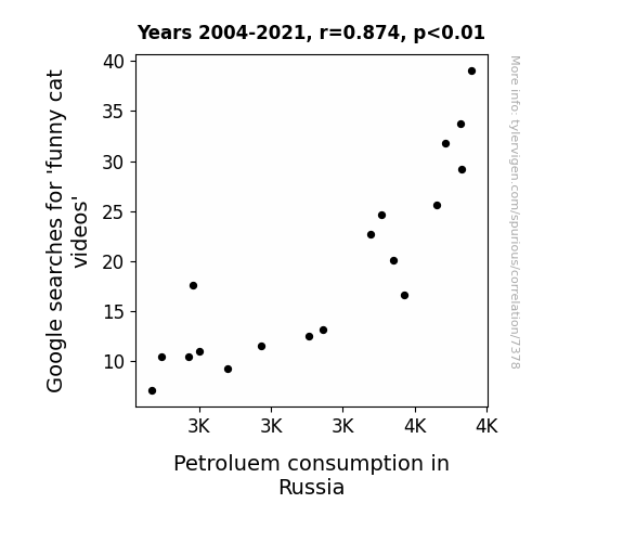 This means 76.4% of the change in the one variable (i.e., Petroluem consumption in Russia) is predictable based on the change in the other (i.e., Google searches for 'funny cat videos') over the 18 years from 2004 through 2021.