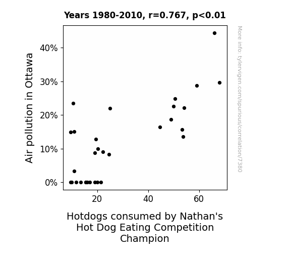 This means 58.9% of the change in the one variable (i.e., Hotdogs consumed by Nathan's Hot Dog Eating Competition Champion) is predictable based on the change in the other (i.e., Air pollution in Ottawa) over the 31 years from 1980 through 2010.
