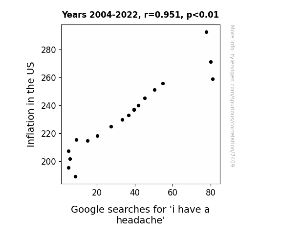 This means 90.4% of the change in the one variable (i.e., Google searches for 'i have a headache') is predictable based on the change in the other (i.e., Inflation in the US) over the 19 years from 2004 through 2022.