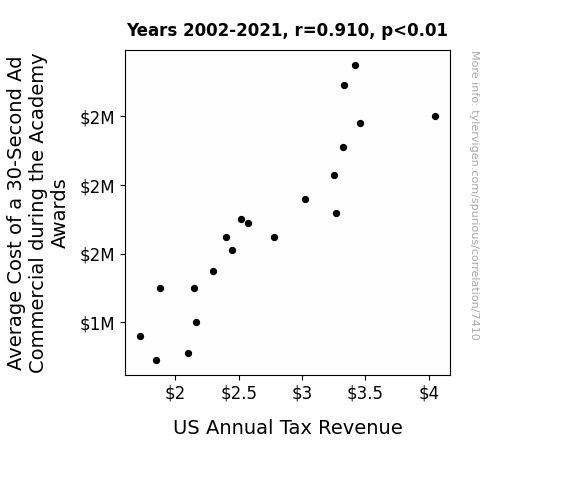 This means 82.8% of the change in the one variable (i.e., US Annual Tax Revenue) is predictable based on the change in the other (i.e., Average Cost of a 30-Second Ad Commercial during the Academy Awards) over the 20 years from 2002 through 2021.