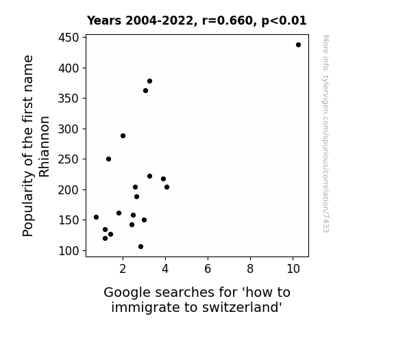 This means 43.6% of the change in the one variable (i.e., Google searches for 'how to immigrate to switzerland') is predictable based on the change in the other (i.e., Popularity of the first name Rhiannon) over the 19 years from 2004 through 2022.