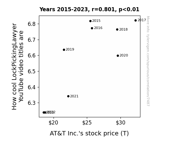 This means 64.2% of the change in the one variable (i.e., AT&T Inc.'s stock price (T)) is predictable based on the change in the other (i.e., How cool LockPickingLawyer YouTube video titles are) over the 9 years from 2015 through 2023.