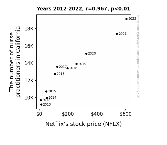 This means 93.5% of the change in the one variable (i.e., Netflix's stock price (NFLX)) is predictable based on the change in the other (i.e., The number of nurse practitioners in California) over the 11 years from 2012 through 2022.