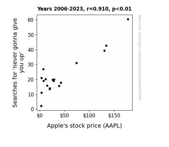 This means 82.9% of the change in the one variable (i.e., Apple's stock price (AAPL)) is predictable based on the change in the other (i.e., Searches for 'never gonna give you up') over the 18 years from 2006 through 2023.