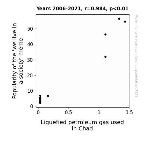 This means 96.8% of the change in the one variable (i.e., Liquefied petroleum gas used in Chad) is predictable based on the change in the other (i.e., Popularity of the 'we live in a society' meme) over the 16 years from 2006 through 2021.