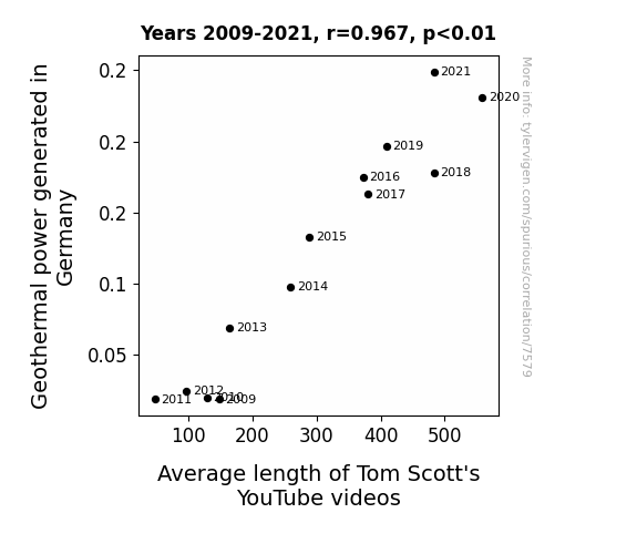 This means 93.5% of the change in the one variable (i.e., Average length of Tom Scott's YouTube videos) is predictable based on the change in the other (i.e., Geothermal power generated in Germany) over the 13 years from 2009 through 2021.
