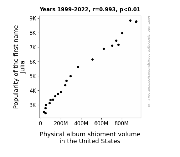 This means 98.5% of the change in the one variable (i.e., Physical album shipment volume in the United States) is predictable based on the change in the other (i.e., Popularity of the first name Julia) over the 24 years from 1999 through 2022.