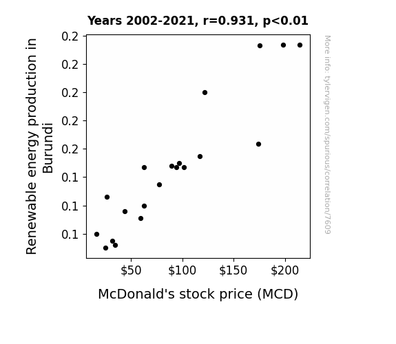This means 86.6% of the change in the one variable (i.e., McDonald's stock price (MCD)) is predictable based on the change in the other (i.e., Renewable energy production in Burundi) over the 20 years from 2002 through 2021.