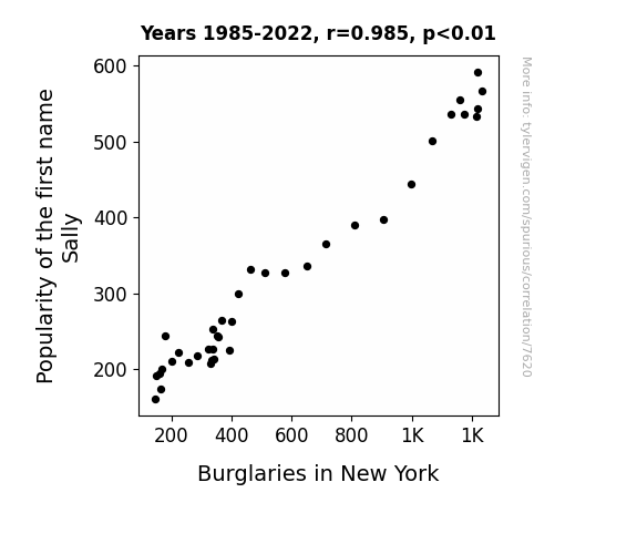 This means 97.1% of the change in the one variable (i.e., Burglaries in New York) is predictable based on the change in the other (i.e., Popularity of the first name Sally) over the 38 years from 1985 through 2022.